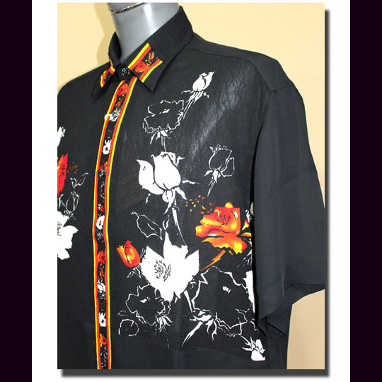 赤と黄色のコントラストがポイントのプリント花柄を施した、オープン・シャツ。