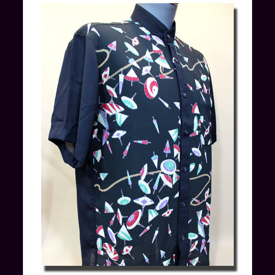 きものの柄のような和柄唐傘プリントを施した、オープン・シャツ。